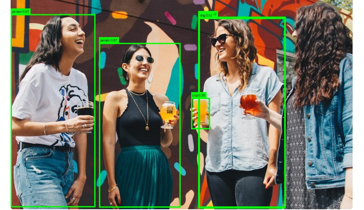 Object detection is performed using the YOLO (You Only Look Once) family of models, allowing the system to identify and localize multiple objects such as people, vehicles, animals, and everyday street scenes in a single pass. Users can dynamically switch between different YOLO model sizes to balance speed and accuracy, and optionally toggle confidence scores in the detection output.